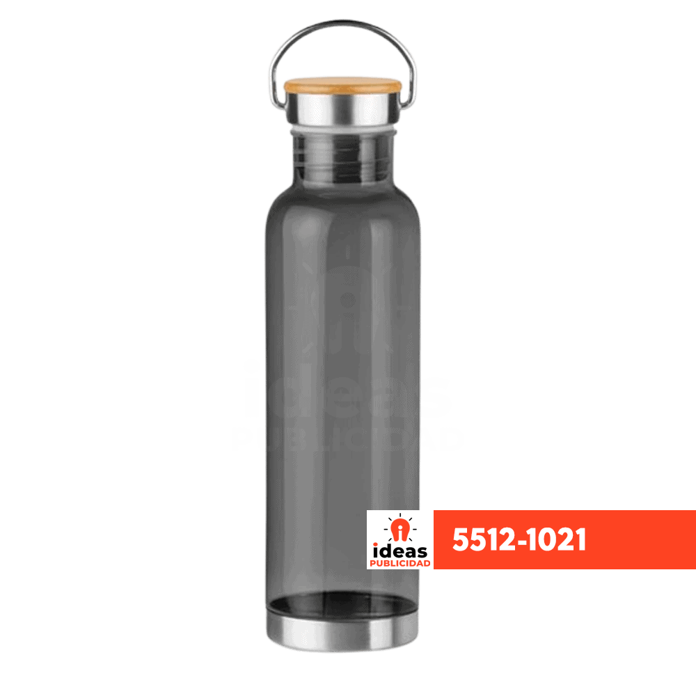 | Caracteristicas: | Botella promocional de plástico translúcido con tapa de bambú, asa y base metálica |