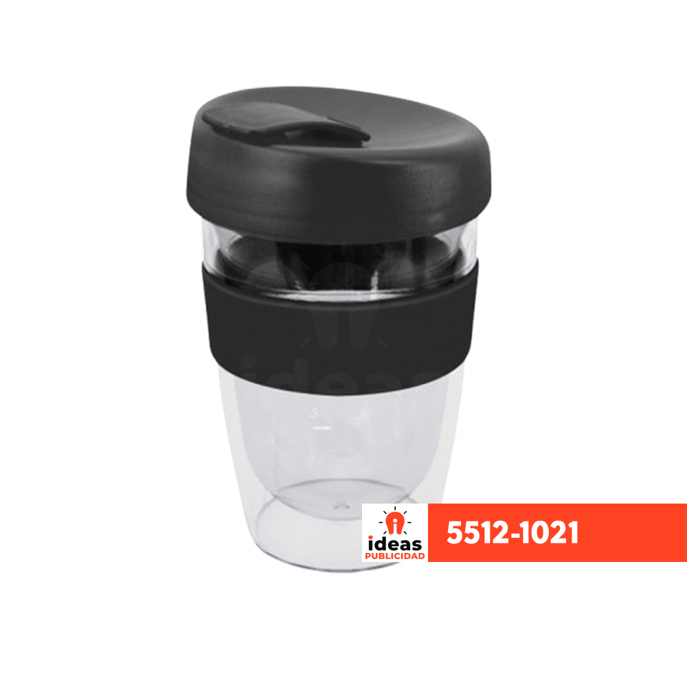 | Caracteristicas: | Tumbler, de acrílico transparente de doble pared aislante, con banda de silicón y tapa flip-top |